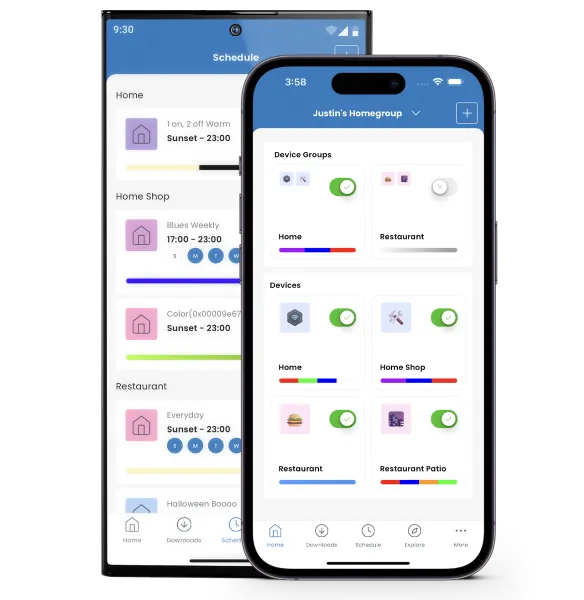 Pick true warm-white or millions of colors, fine-tune brightness and speed, and design custom patterns with individually addressable LEDs. Create zones (roofline, peaks, soffits, patio) so each area can run its own look, or sync everything for a unified scene. Save favorites, build playlists for holidays and events, and automate daily/weekly schedules so your lights turn on and off exactly when you want.